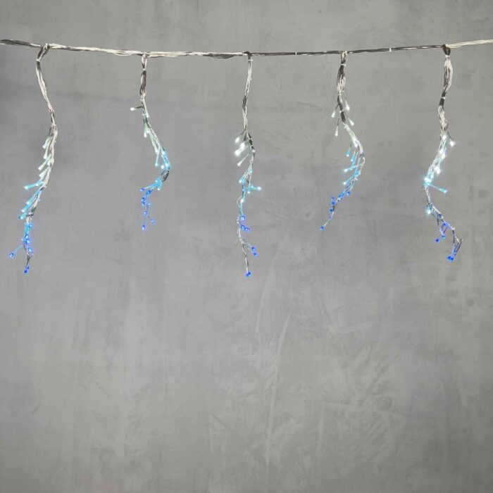 Гирлянда-бахрома с эффектом бегущего огня, бело-синее свечение, 1,75×0,4 м, 320 LED, 8 режимов, питание 24 В. Подходит для уличного оформления. Гибкий прозрачный силиконовый провод, степень защиты IP65, подключение в комплекте.