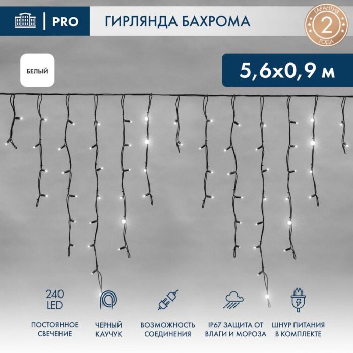 Гирлянда-бахрома 5,6×0,9 м с постоянным белым свечением. 240 ярких светодиодов, IP67, провод из прочного чёрного каучука 3,3 мм. Соединяется до 84 метров в цепь. Подходит для уличной и интерьерной подсветки. Гарантия — 24 месяца. Продажа и монтаж по Москве и МО.
