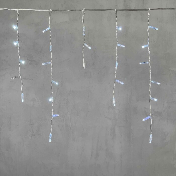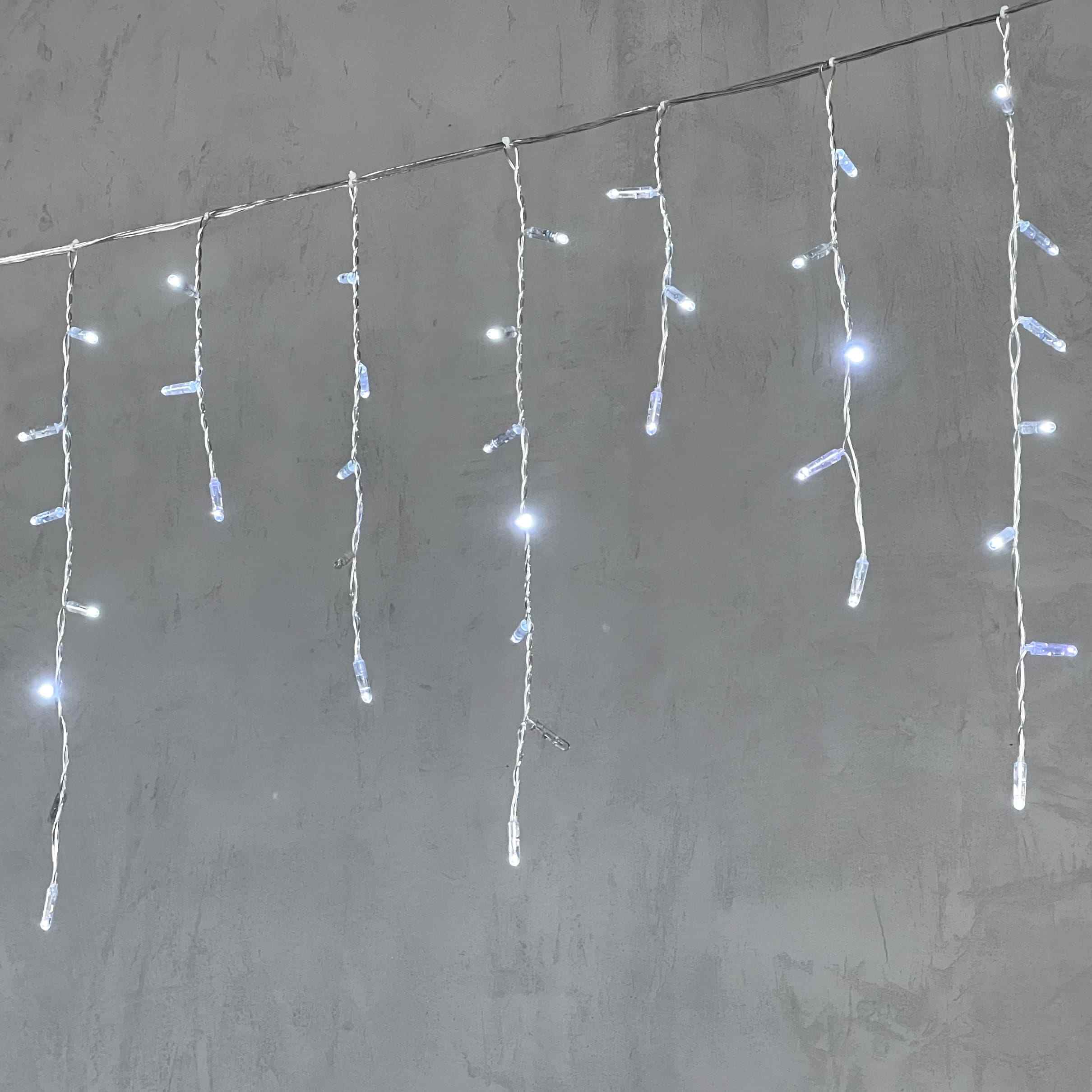 Компактная гирлянда-бахрома длиной 4,9 м с колпачками и белым светом. 195 диодов, эффект мерцания, прозрачный ПВХ-провод, IP65, готова к уличному применению. Идеальна для фасадов и новогоднего оформления.
