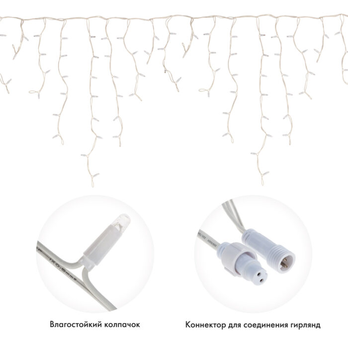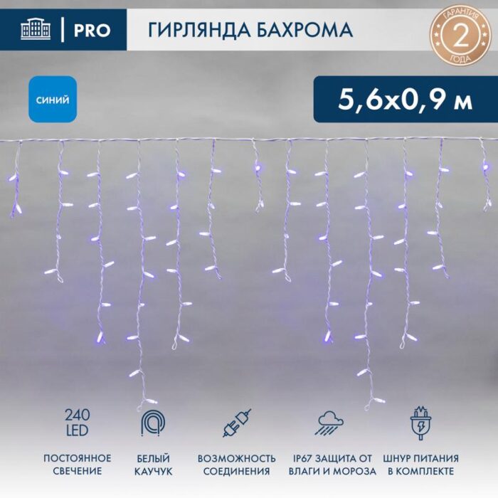 Профессиональная гирлянда-бахрома длиной 5,6 м с холодным синим свечением. Постоянный режим. Провод — белый морозостойкий каучук 2,3 мм. Подходит для улицы и дома. Надёжная влагозащита IP67, соединение до 56 м в одну линию.