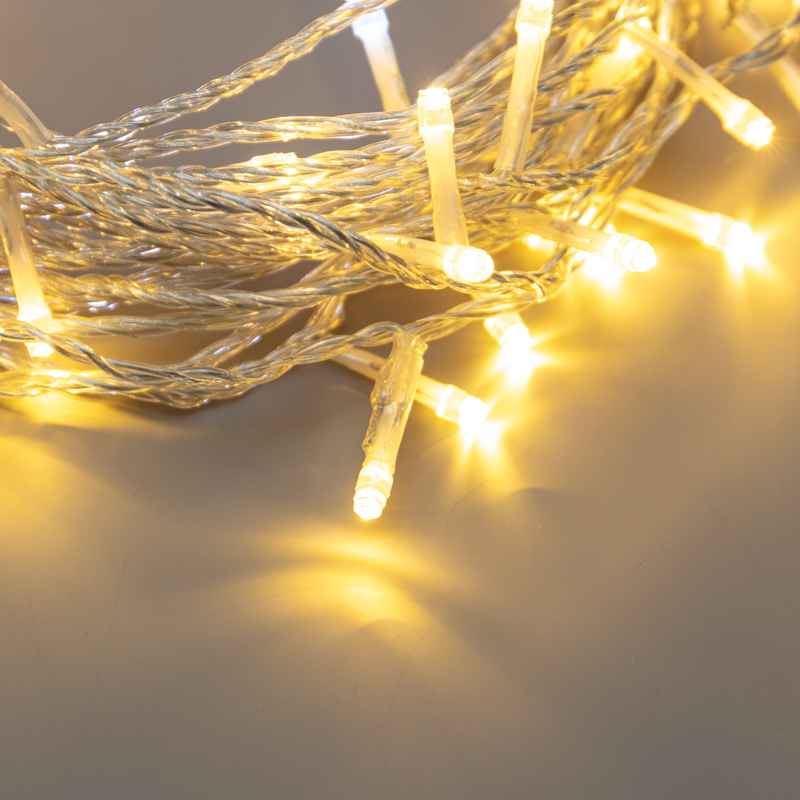 Компактная тёплая гирлянда длиной 10 метров с мягким эффектом мерцания. Прозрачный ПВХ-провод, защита IP44, питание от сети 230 В. Подходит для уличного и интерьерного оформления. Готова к установке — шнур питания 3 м в комплекте.