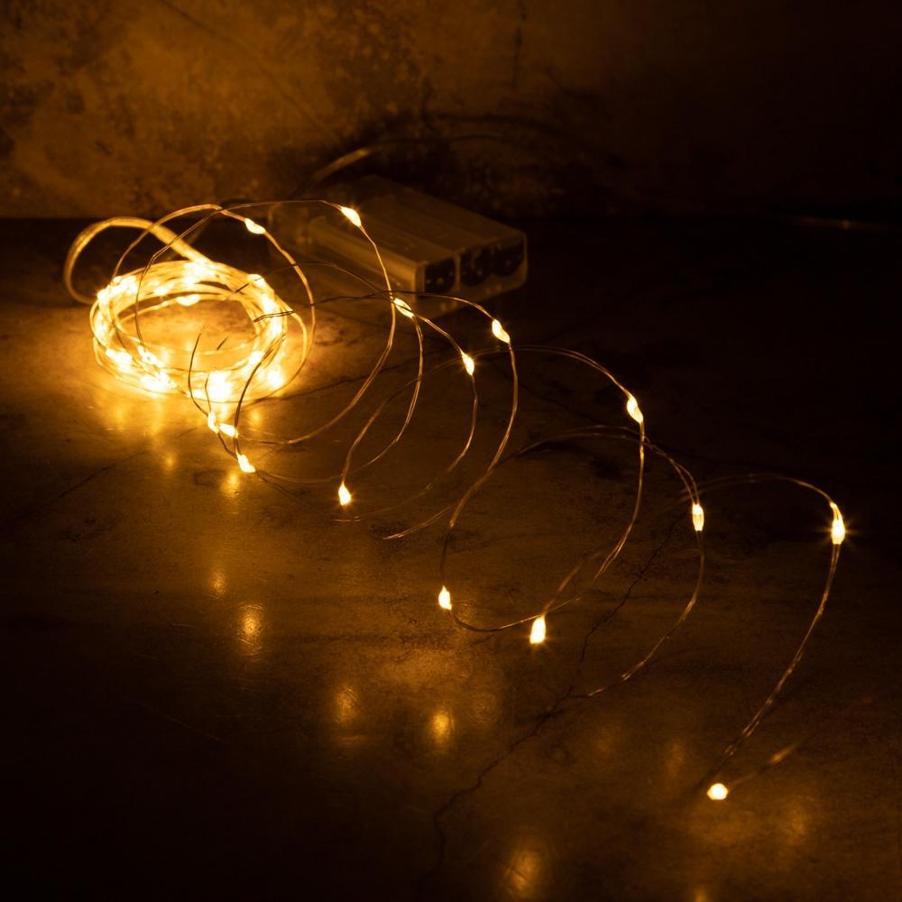 Маленькие светящиеся точки равномерно распределены по всей длине провода. Визуально создаётся ощущение, будто капли света зависли в воздухе — особенно красиво на фоне стекла или зеркала.