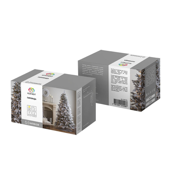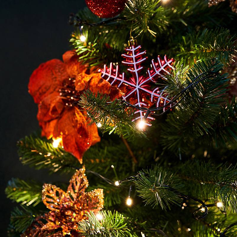Эта гирлянда создаёт то самое «тёплое» ощущение Нового года. Тепло-белый свет — мягкий, спокойный, без резких оттенков. Он комфортен для глаз, идеально сочетается с деревянными и тёмными элементами интерьера и выгодно подчёркивает украшения на ёлке.