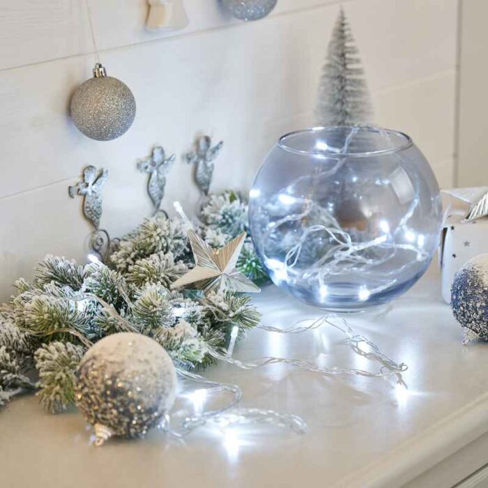 Белый свет подчёркивает атмосферу зимней свежести и гармонично сочетается с любыми цветами украшений — от ярких красно-золотых до сдержанных серебристых.