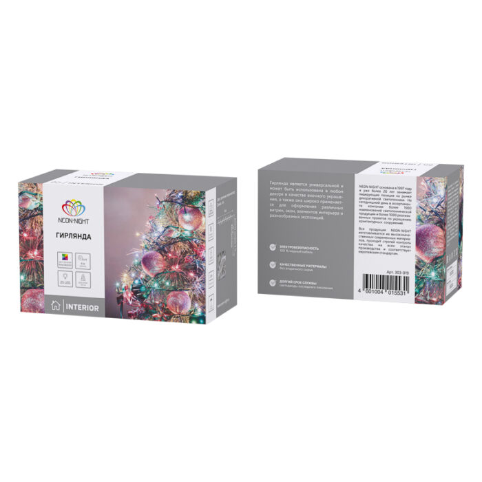 Яркая гирлянда длиной 4 м с разноцветным свечением и динамическими эффектами. Подходит для оформления ёлок, окон, каминов и праздничных композиций. 25 LED, 8 режимов, зелёный ПВХ-провод, питание от сети.