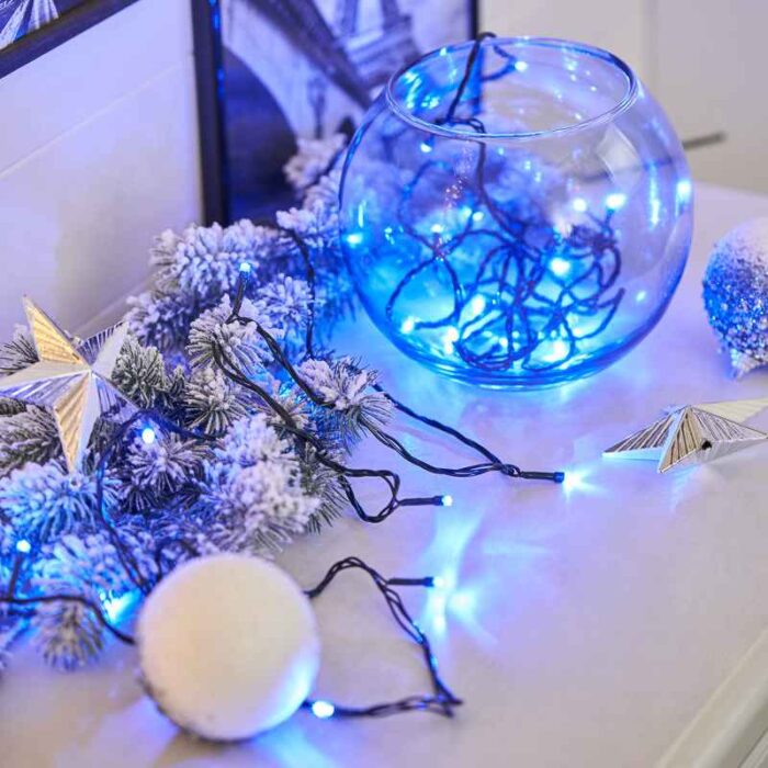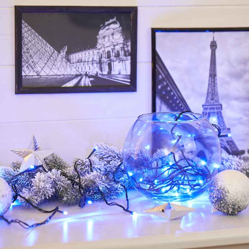 Компактная и эффектная гирлянда длиной 4 м с насыщенным синим свечением и динамическими режимами. Подходит для украшения ёлок, окон, каминов и интерьера. 25 LED, зелёный ПВХ-провод, 8 режимов, питание от сети.