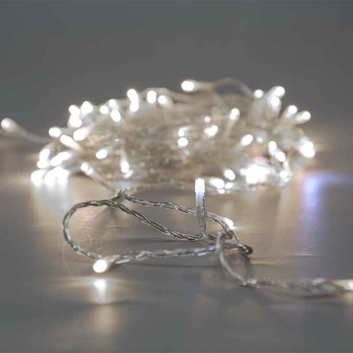 Тонкая гирлянда «Роса» длиной 20 метров с 200 белыми диодами и эффектом лёгкого мерцания. Изящный серебристый провод, защита IP44, питание от сети. Идеальна для деревьев, кустов, перил, фотозон и зонирования.