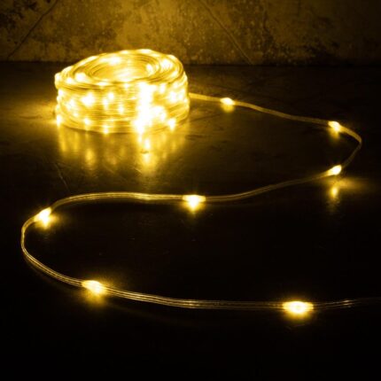 Гирлянда с каплями росы длиной 20 метров, 200 тёплых светодиодов с мягким мерцанием. Гибкий прозрачный провод, питание 24 В от сети, защита IP44. Подходит для оформления интерьеров и тёплых уличных зон.