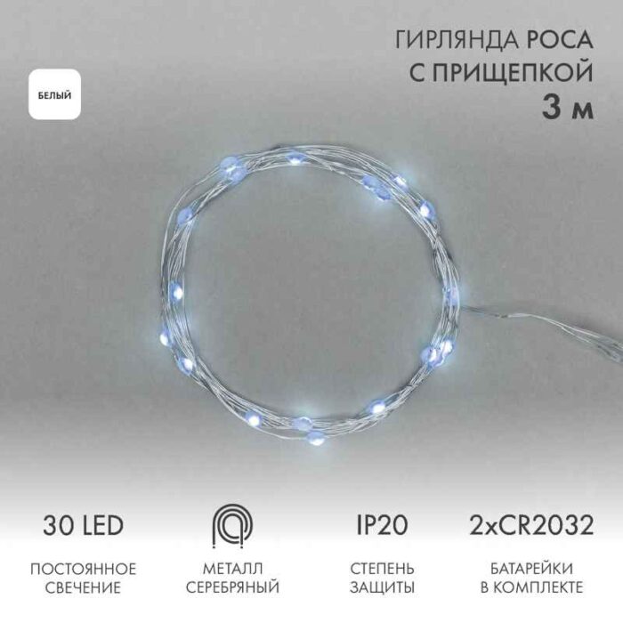 Гирлянда Роса с прищепками 3 м Белая Статика, 30 LED, Серебряный металл, IP20, NN