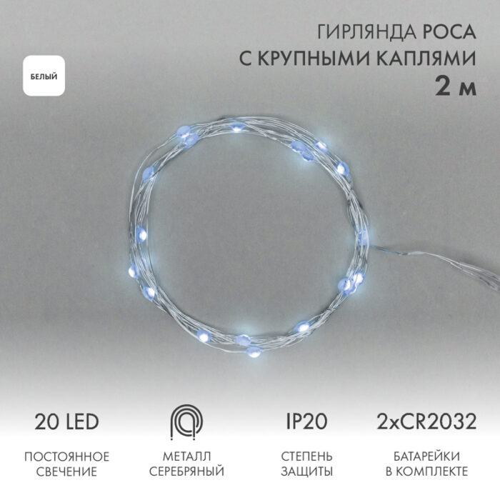 Гирлянда Роса с крупными каплями 2 м Белая Статика, 20 LED, Серебристый металл, IP20, NN