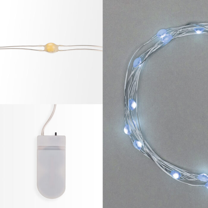Гибкий серебристый провод легко принимает любую форму, не заламывается и почти незаметен на фоне стеклянных и светлых предметов. Благодаря питанию от батареек (6 В) гирлянду можно размещать в любом месте — от центра праздничного стола до подвесных композиций, не ограничиваясь розетками и проводами.