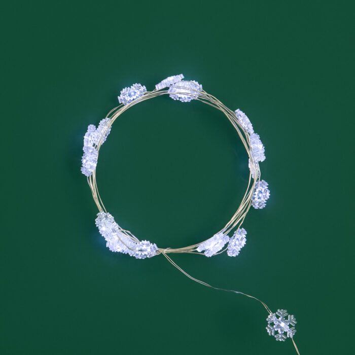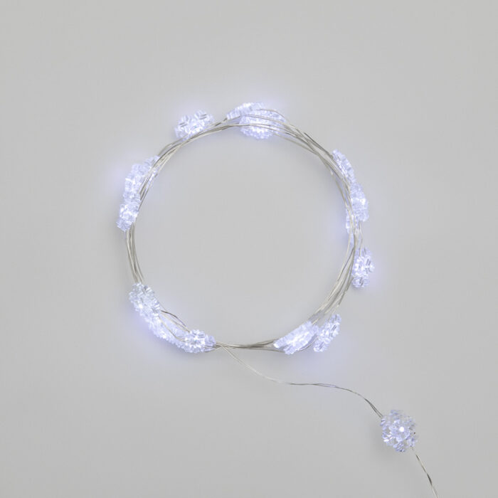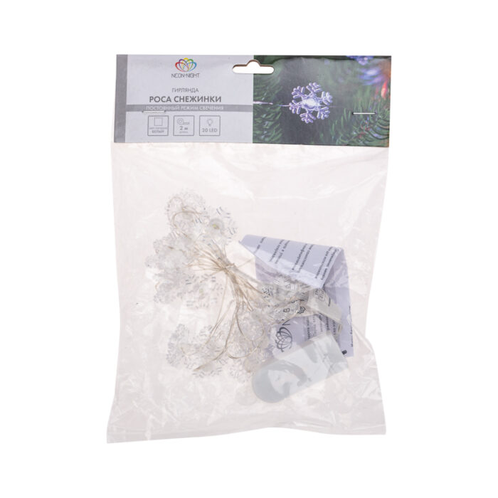 Элегантная гирлянда «Роса» длиной 2 м с 20 белыми светодиодами в фигурках снежинок. Прозрачный провод делает оформление лёгким и воздушным, а питание от батареек позволяет размещать декор в любом месте без розеток.