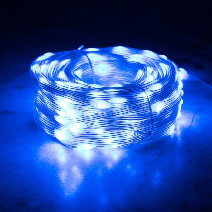 Синий цвет свечения — классика зимнего и вечернего оформления. Он хорошо смотрится на белом, сером и даже тёмном фоне, подчёркивает глубину пространства и вызывает ощущение прохлады и волшебства. Сочетается с белыми, серебристыми, золотыми и фиолетовыми тонами.