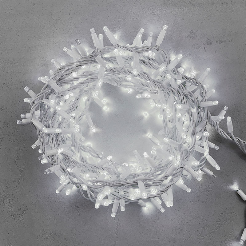 Премиальная гирлянда нить длиной 10 м с 300 белыми LED-лампами в форме шатровых колпачков. Белый каучуковый провод устойчив к морозу, мерцание добавляет «живого» свечения. Подходит для улицы — деревья, заборы, колонны, перила.