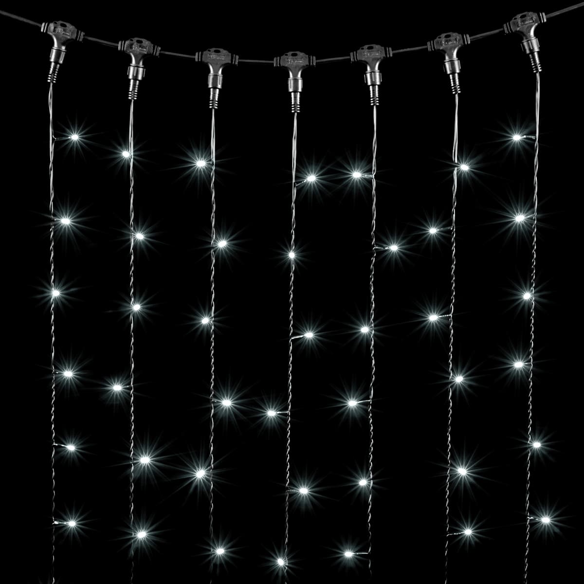 Гирлянда-занавес 1x9 м с чистым белым светом — это классика архитектурного декора. Она подходит как для праздничных мероприятий, так и для постоянного оформления объектов. Равномерное свечение создаёт аккуратный, элегантный вид, а чёрный кабель позволяет гирлянде органично смотреться на тёмных фасадах и в вечернее время.