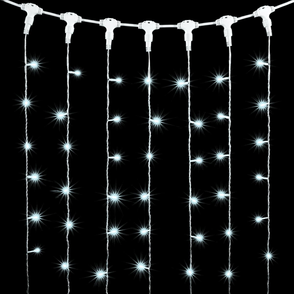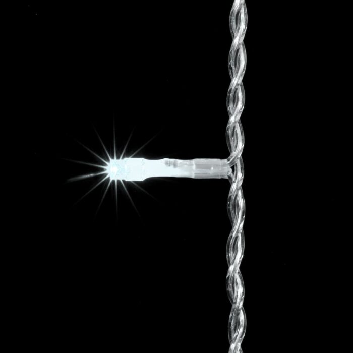 Профессиональная уличная гирлянда-занавес 1×9 м с белым светом и эффектом мерцания. 900 LED, прозрачный ПВХ-кабель, защита IP54. Подходит для фасадов, заборов и колонн. Соединение до 10 секций.