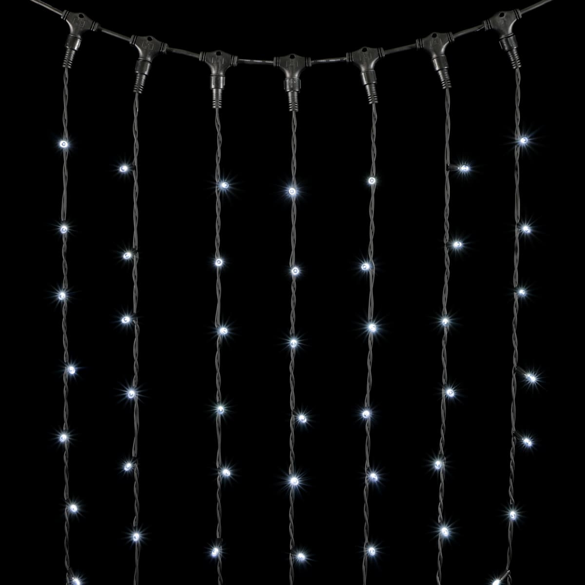 Премиальная уличная гирлянда-занавес 2×2 м с 400 белыми LED и чёрным каучуковым проводом 3 мм. IP65, морозостойкая, соединяется до 10 секций, срок службы 15 000 часов.