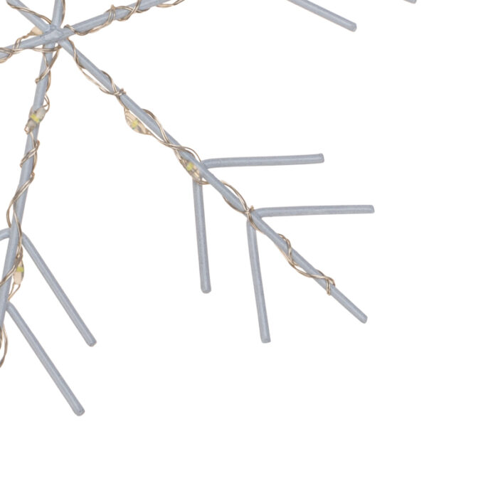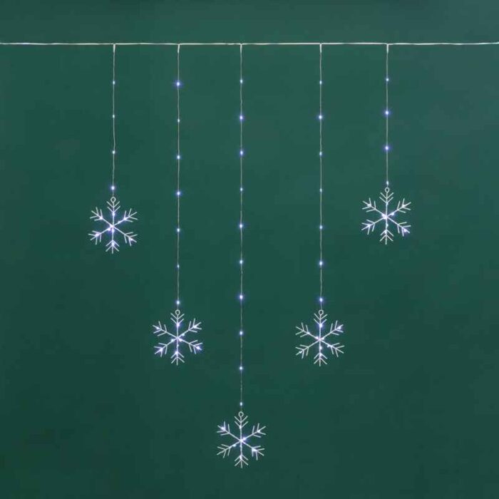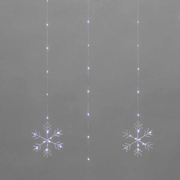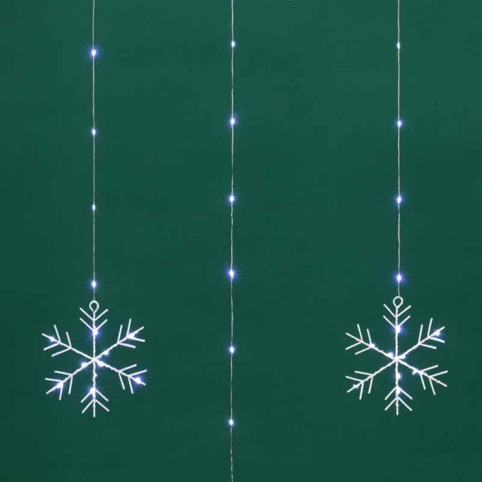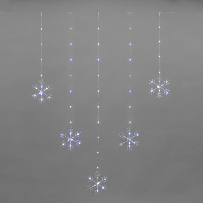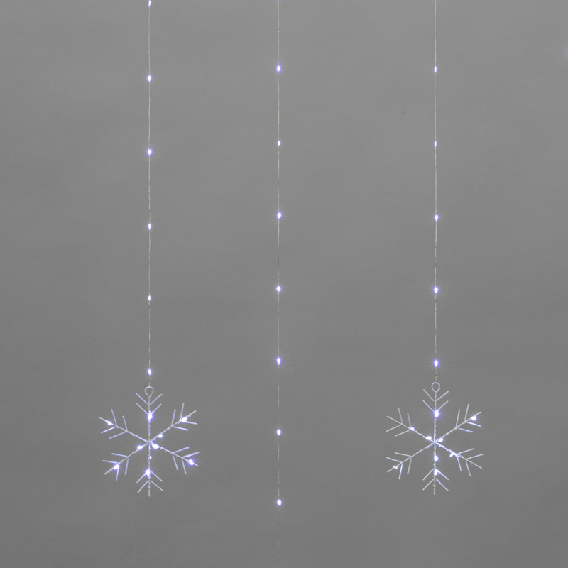 Главная особенность модели — фигурки снежинок, равномерно распределённые по занавесу. Они не просто украшают гирлянду, а становятся центральным элементом композиции. Белое сияние подчеркивает их форму, а переливы динамики создают игру света, будто снежинки кружатся в танце. Такой дизайн идеально подходит для создания зимней сказки в интерьере.