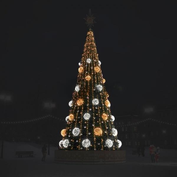 Комплект включает полусферы трёх диаметров — 0,45 м, 0,6 м и 0,72 м, а также пластиковые шары и светотехнику профессиональной серии OPTIMA-PRO. Элементы размещаются по поверхности ели в динамичном рисунке, создавая объёмный эффект и иллюзию движения.