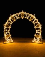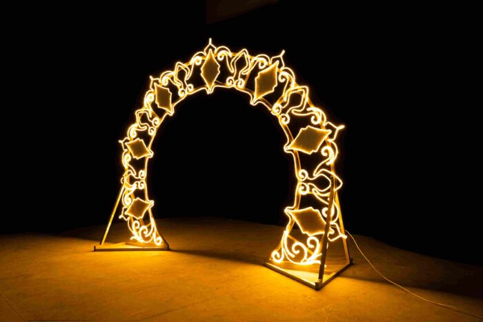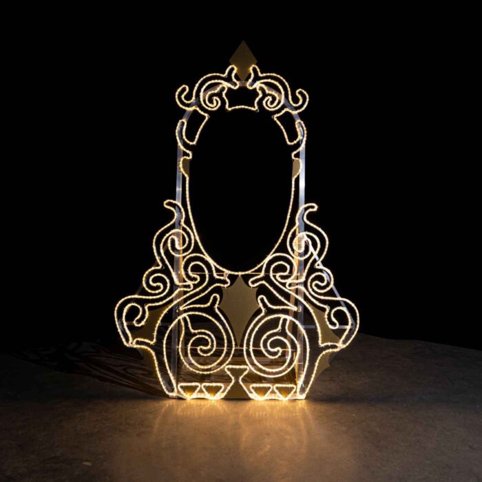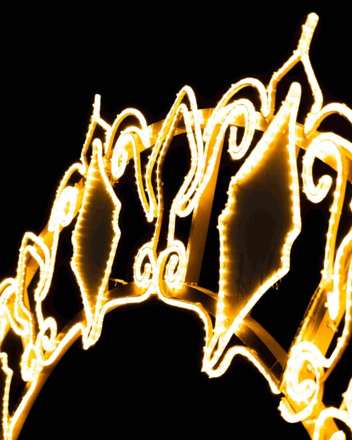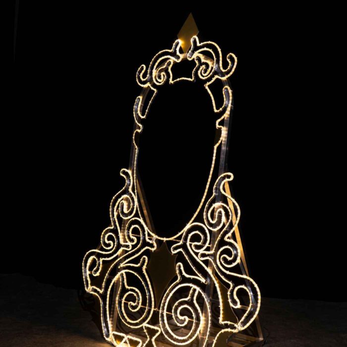 Все элементы комплекта изготовлены из алюминиевого каркаса с порошковой покраской. Это обеспечивает устойчивость к коррозии, низкому температурному режиму и механическим повреждениям. Арка имеет габариты 3,94×3,12 м, фотозона — 1,88×2,9×0,93 м, а фигура-подарок — 1,40×1,56×1,26 м. Это позволяет формировать полноценное новогоднее оформление даже на большой площади.