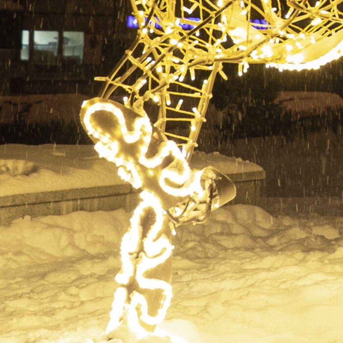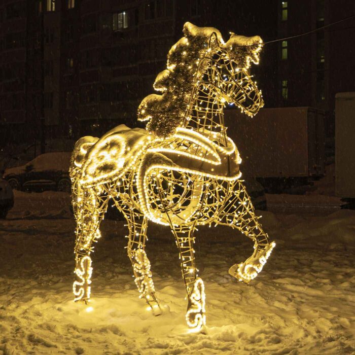 Световая композиция «Три лошади с санями» — это масштабная, эффектная и яркая инсталляция, способная стать настоящим символом новогоднего настроения. Она притягивает взгляды, останавливает прохожих, становится местом для фото и главным украшением локации. Комплект включает три объёмные фигуры лошадей и каркасные сани с изящными деталями. В вечернее время композиция преображается — светится мягким золотым светом, создавая атмосферу сказки и волшебства.
