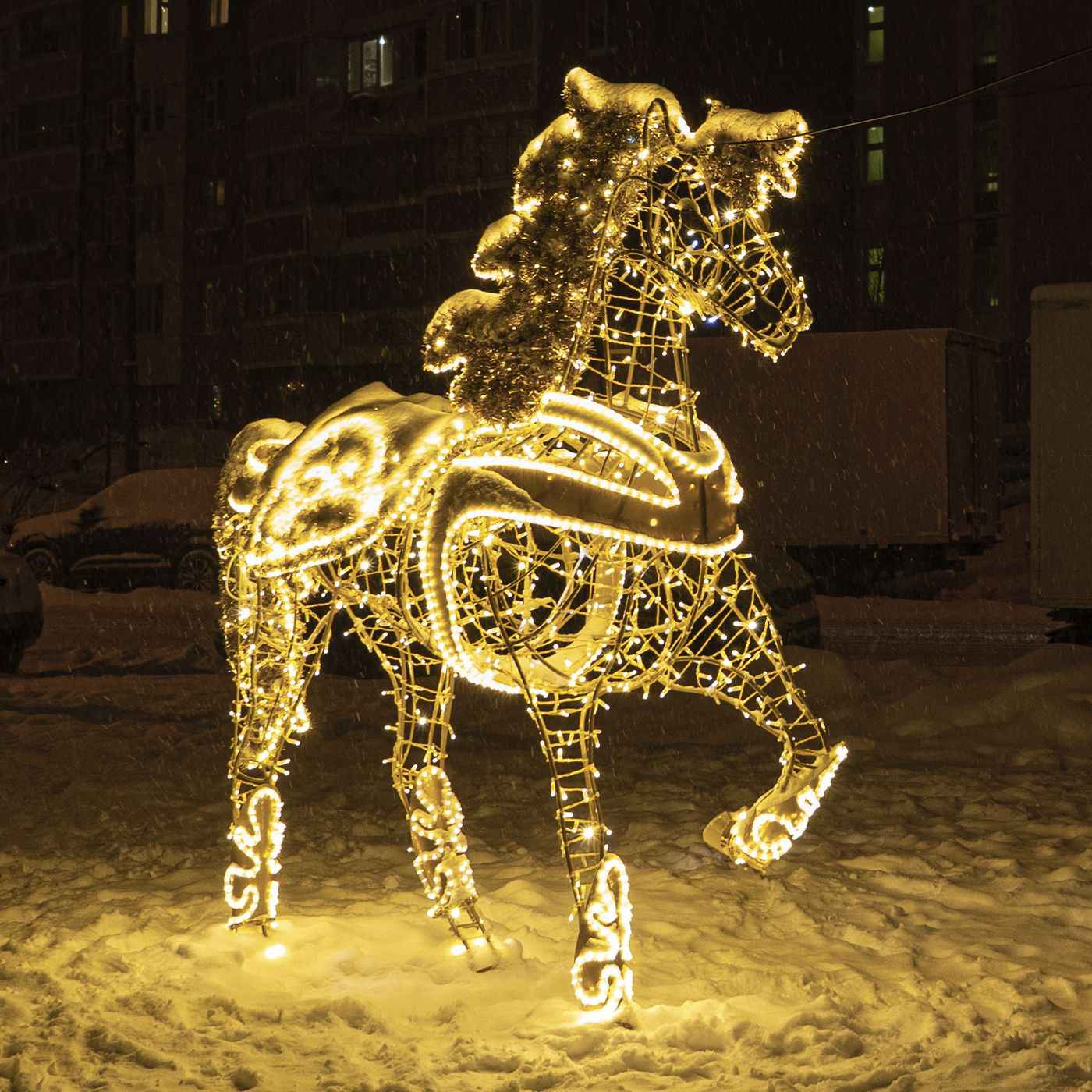 Зрелищная новогодняя композиция: три световые лошади и сани с эффектным золотым свечением. Объёмные 3D-фигуры из алюминия с прочной покраской. Идеальны для установки на улице — IP65, рабочая температура до –50 °C. Притягивают внимание и создают праздничное настроение. Доставка, монтаж, брендирование — под ключ от JOYLED.