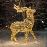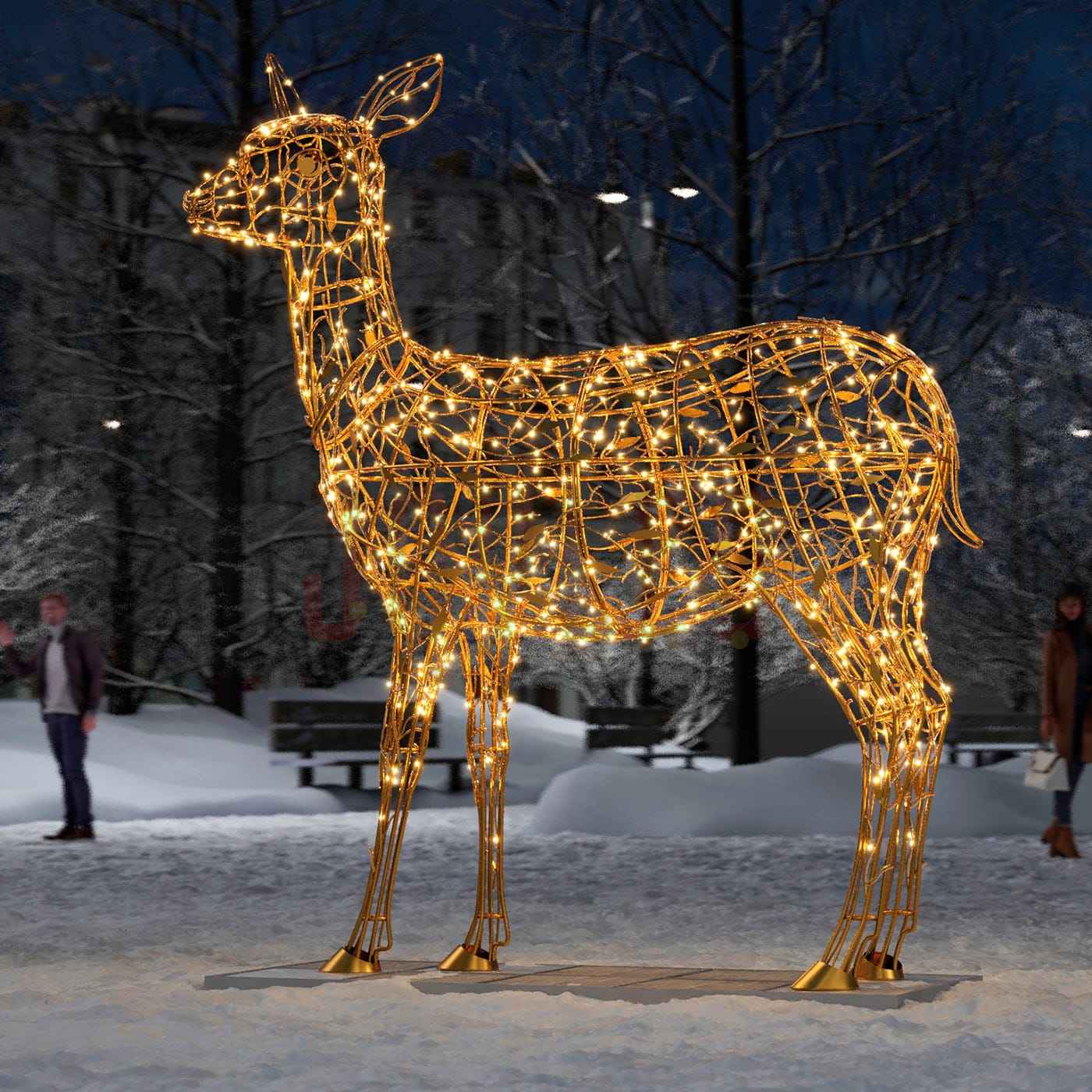 Композиция «Золотые олени» — это полноценная уличная световая декорация, которая хорошо читается как днём, так и вечером, особенно при включённой подсветке.