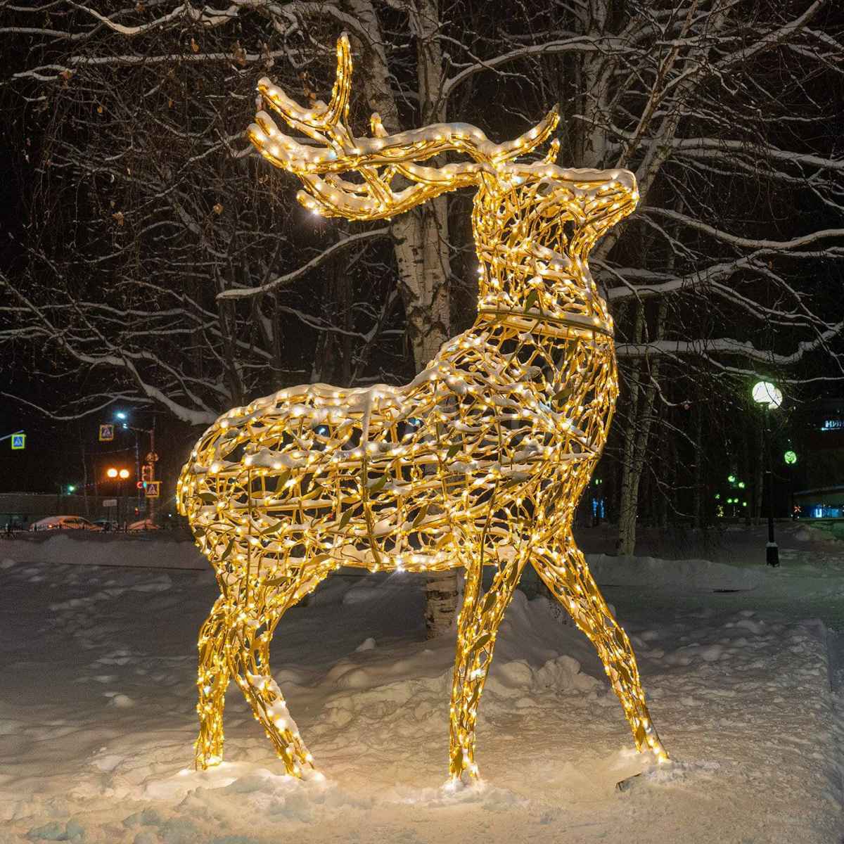 Композиция «Золотые олени» выполнена в теплом свете — оттенке, который подчёркивает чистоту, торжественность и новогоднюю атмосферу. Такое свечение идеально смотрится в вечернее время, отражается на снегу и придаёт сцене эффект морозной сказки.