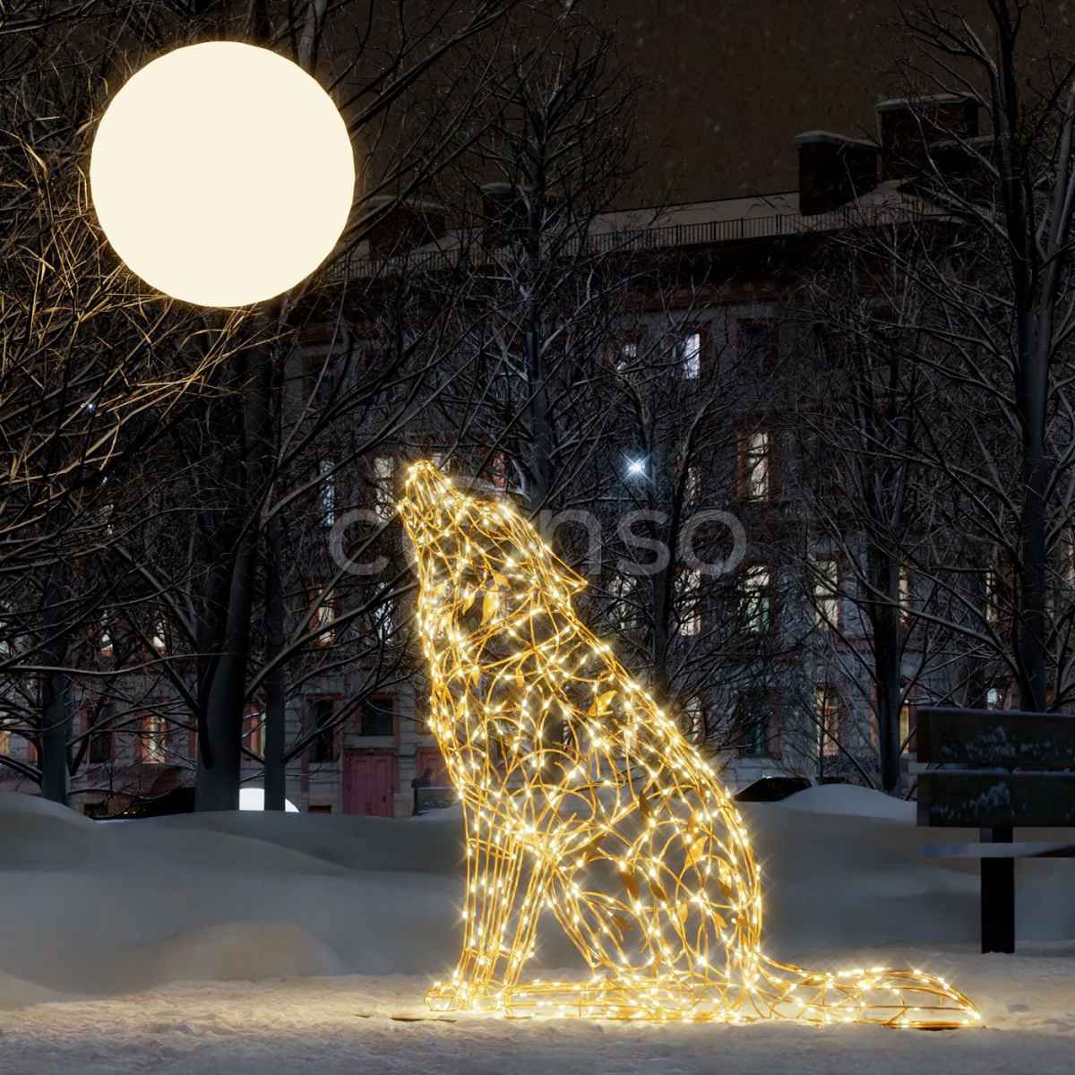 Драматичная световая композиция воссоздаёт романтичную сцену волка, воющего на полную луну. Волк высотой 1,85 метра и светящийся шар-луна диаметром 0,8 метра создают завораживающую картину. Алюминиевый каркас серии PREMIUM PRO выдерживает морозы до -50°C. Тёплое свечение создаёт атмосферу таинственности и природной гармонии. JOYLED предлагает уникальные световые композиции для создания незабываемых арт-объектов в городском пространстве.