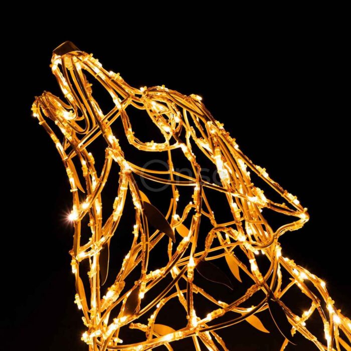 Равномерное распределение световых элементов подчёркивает выразительность силуэта волка и создаёт мягкое свечение луны. Композиция особенно эффектно смотрится в сумерках, когда контраст между тёмным небом и светящимися фигурами достигает максимума.