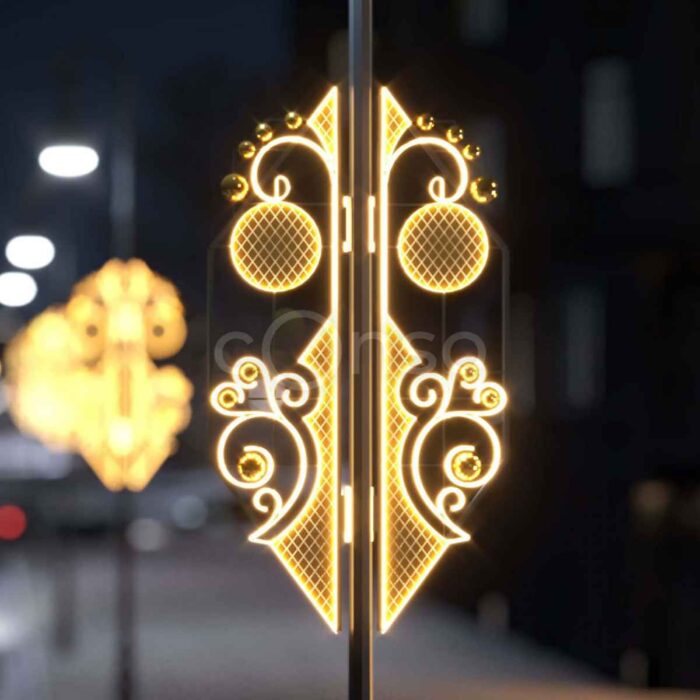 Новогодняя консоль для уличных столбов — это декоративная световая фигура, предназначенная для сезонного оформления опор наружного освещения. Она создаёт праздничную атмосферу в городской среде, подчёркивает архитектуру улиц, придаёт уют и торжественность пространству. Размер — 0,95×2 метра, цвет свечения — насыщенное золотое.
