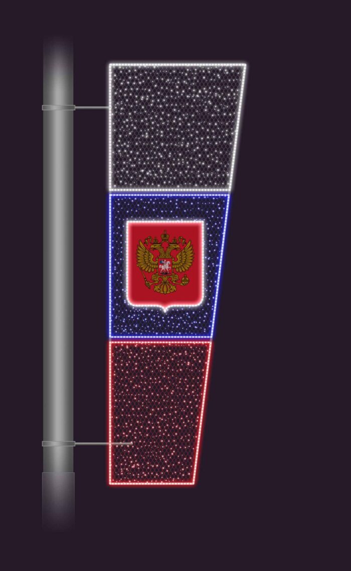 Световая консоль МАФ-508 — это декоративная световая фигура в виде вертикальной 2D-консоли, предназначенная для размещения на опорах уличного освещения, фасадах зданий и других городских конструкциях. Её яркое бело-сине-красное свечение делает её идеальным решением для оформления территорий в период государственных и городских праздников: Дня Победы, Дня России, Дня города, 23 февраля и других событий.