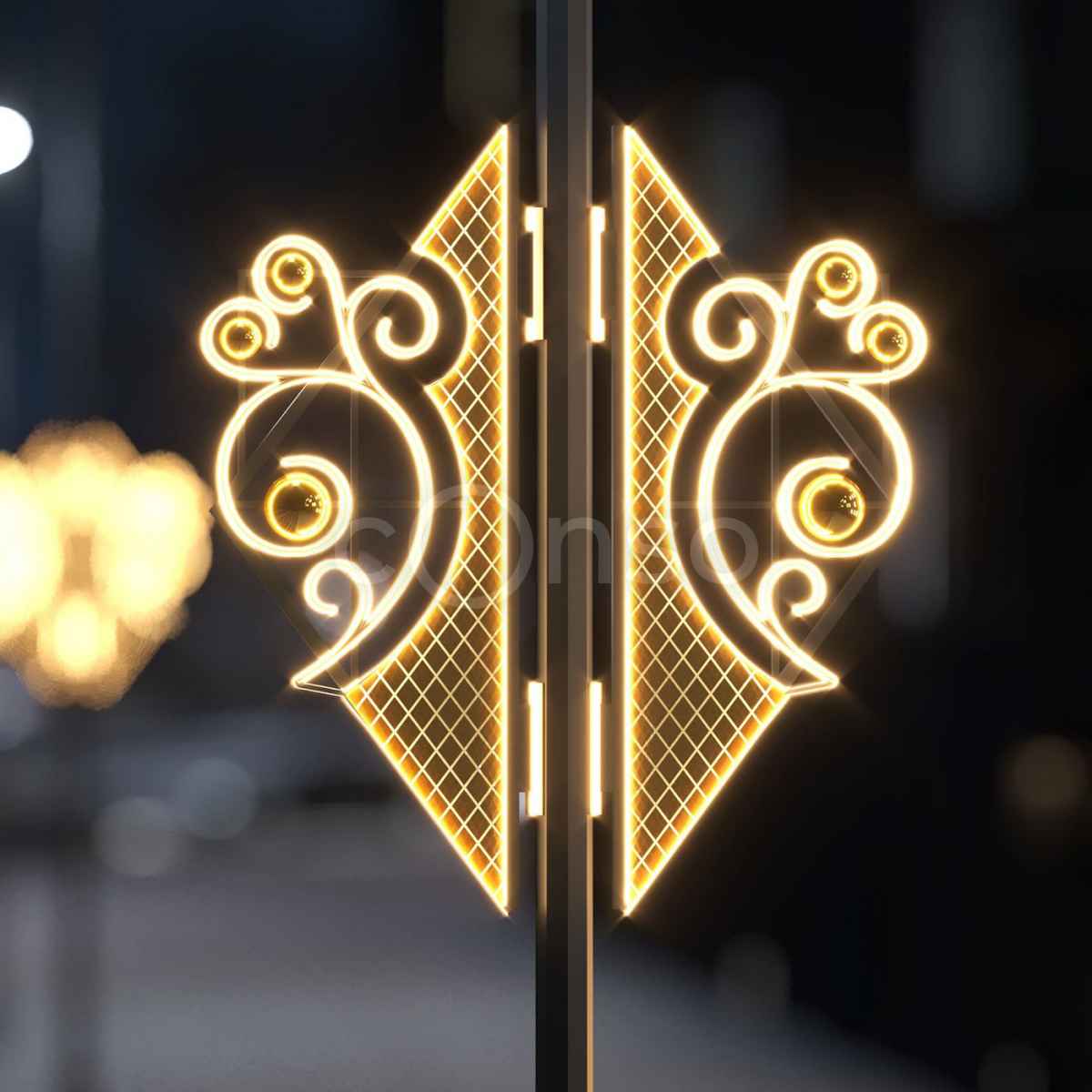 Форма конструкции подобрана так, чтобы быть заметной на расстоянии, но при этом не загромождать улицу. Фигура имеет размер 0,95×1,17 м, легко крепится к столбам и не требует сложного монтажа. Благодаря изящному силуэту и яркому свечению, одна консоль визуально «держит» до 15–20 м пространства — особенно эффектно смотрится в ряде из нескольких элементов.