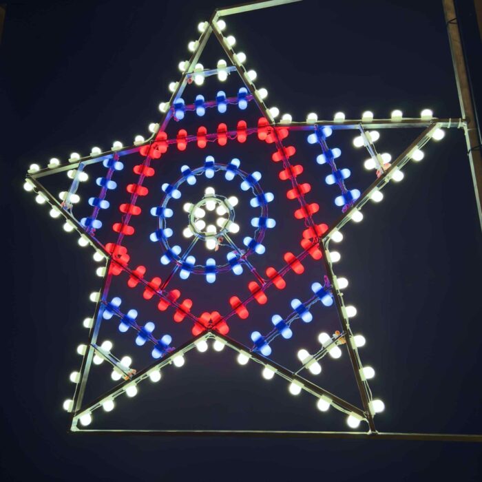 Световая консоль «Ретро Звезда» — это яркий декоративный элемент с узнаваемым силуэтом, идеально подходящий для оформления улиц ко Дню Победы, Дню России, Новому году и другим торжествам. Эффект триколора — красного, синего и белого свечения — подчёркивает патриотический дух и создаёт тёплую, эмоциональную атмосферу. Конструкция выглядит лаконично, но в тёмное время суток создаёт мощный визуальный акцент. Такие консоли востребованы при украшении городских улиц, фасадов зданий, опор освещения, входных групп.