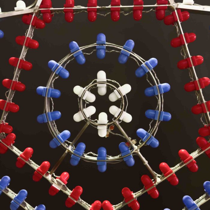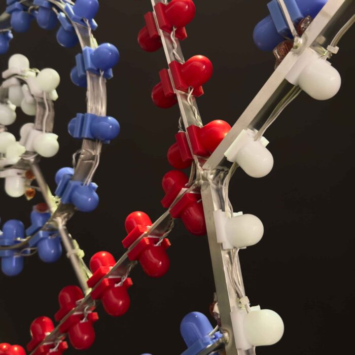 Каркас консоли изготовлен из оцинкованной стали с порошковой окраской, устойчив к перепадам температуры, осадкам и механическим нагрузкам. Светодиодная система работает от сети 220 В, светится статично, без мерцания. Диоды надёжно закреплены на чёрном проводе — он незаметен на фоне конструкции и не отвлекает от светового рисунка. Размер консоли — 1,2×1,3 м — подходит для стандартных уличных опор, колонн и фасадов.