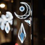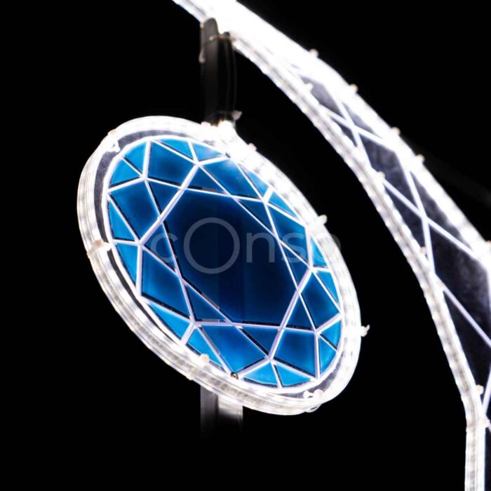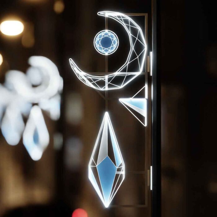 Такие световые консоли — один из самых эффективных и удобных форматов оформления. Они компактны, легко устанавливаются на опоры освещения и создают цельную композицию даже при размещении через каждые 20–30 метров. Фигура «Серёжка с полумесяцем» особенно хорошо смотрится в череде одинаковых элементов, подчёркивая ритм улицы и усиливая впечатление от прогулки или входа в здание.
