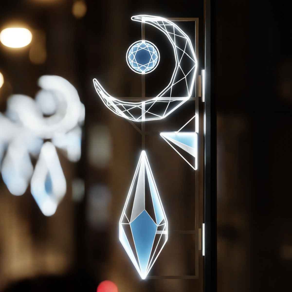 «Серёжка с полумесяцем» — уличная световая консоль с холодным свечением, разработанная для украшения опор освещения, фасадов, колонн и входных зон. Эта фигура сочетает в себе изящество формы, надёжность конструкции и современное световое решение. Благодаря узнаваемому силуэту и яркому свечению она мгновенно превращает любое пространство в атмосферную новогоднюю локацию.