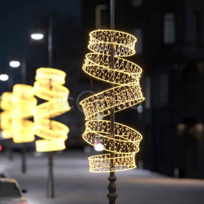 Элегантная праздничная консоль размером 1,5×3×1,5 метра с золотистым свечением для крепления на столбы освещения. Алюминиевый каркас с покраской серии OPTIMA-PRO создаёт роскошный визуальный эффект переплетающихся колец. Питание 220В упрощает подключение к городской сети. JOYLED производит консольные украшения премиального уровня для создания торжественной атмосферы на городских улицах и корпоративных территориях.