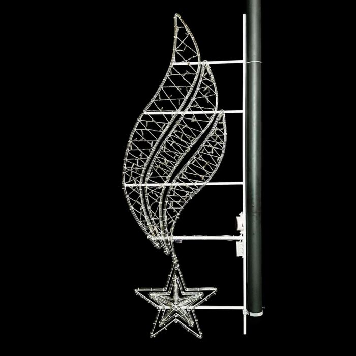 Форма «звезда с флагом» хорошо воспринимается как отдельный объект, так и в составе серийного оформления — когда несколько консолей размещаются вдоль улицы через равные промежутки. Подходит для комбинирования с перетяжками, гирляндами и другими уличными фигурами.