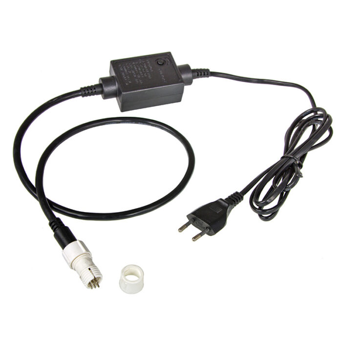 В комплект входят: контроллер с разъемом и игла для подключения разъема к дюралайту. Длина кабеля от разъема до контроллера составляет 0,5 метра, а от контроллера до розетки — 2,5 метра.