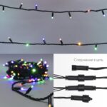Надёжная мультиколор гирлянда длиной 12 м для уличного декора. 120 ярких LED, статичное свечение, чёрный каучуковый провод, IP67. Подходит для оформления деревьев, перил, заборов. Выдерживает морозы до −50 °С. Подключение — в комплекте.