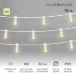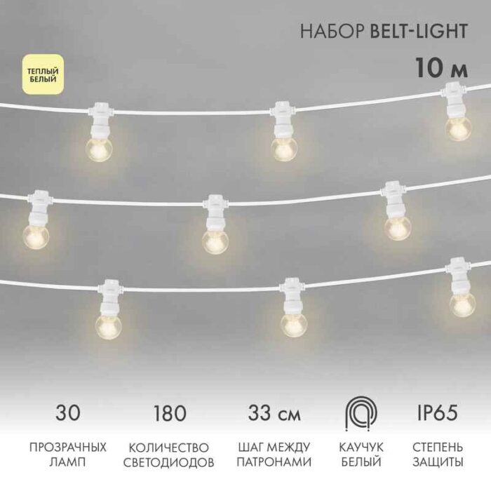 Этот комплект "Белт-Лайт" включает в себя 10-метровую гирлянду с 30 лампочками, каждая из которых имеет диаметр 45 мм. Каждая лампочка оснащена шестью светодиодами, обеспечивающими непрерывное свечение. Питание гирлянды осуществляется от стандартной электросети 220 В. Для подключения к розетке предусмотрен кабель длиной 1,5 метра с вилкой. Степень защиты IP65 позволяет использовать гирлянду как внутри помещений, так и на улице, так как она устойчива к воздействию брызг воды и температурных колебаний.