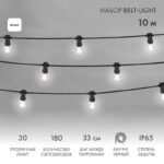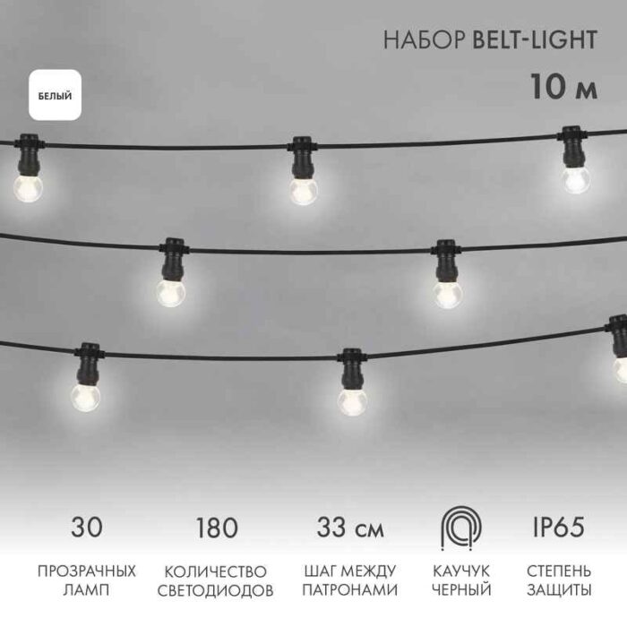 Этот комплект "Белт-Лайт" включает в себя 10-метровую гирлянду с 30 лампочками, каждая из которых имеет диаметр 45 мм. Каждая лампочка оснащена шестью светодиодами, обеспечивающими непрерывное свечение. Питание гирлянды осуществляется от стандартной электросети 220 В. Для подключения к розетке предусмотрен кабель длиной 1,5 метра с вилкой. Степень защиты IP65 позволяет использовать гирлянду как внутри помещений, так и на улице, так как она устойчива к воздействию брызг воды и температурных колебаний.