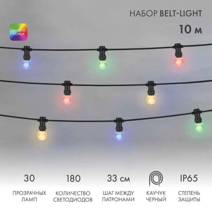 Этот комплект "Белт-Лайт" включает в себя 10-метровую гирлянду с 30 лампочками, каждая из которых имеет диаметр 45 мм. Каждая лампочка оснащена шестью светодиодами, обеспечивающими непрерывное свечение. Питание гирлянды осуществляется от стандартной электросети 220 В. Для подключения к розетке предусмотрен кабель длиной 1,5 метра с вилкой. Степень защиты IP65 позволяет использовать гирлянду как внутри помещений, так и на улице, так как она устойчива к воздействию брызг воды и температурных колебаний.