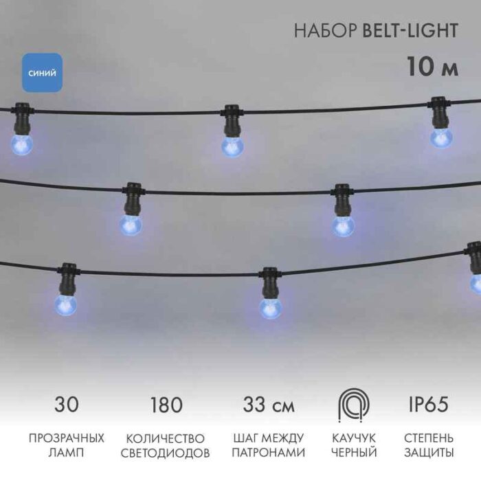 Этот комплект "Белт-Лайт" включает в себя 10-метровую гирлянду с 30 лампочками, каждая из которых имеет диаметр 45 мм. Каждая лампочка оснащена шестью светодиодами, обеспечивающими непрерывное свечение. Питание гирлянды осуществляется от стандартной электросети 220 В. Для подключения к розетке предусмотрен кабель длиной 1,5 метра с вилкой. Степень защиты IP65 позволяет использовать гирлянду как внутри помещений, так и на улице, так как она устойчива к воздействию брызг воды и температурных колебаний.