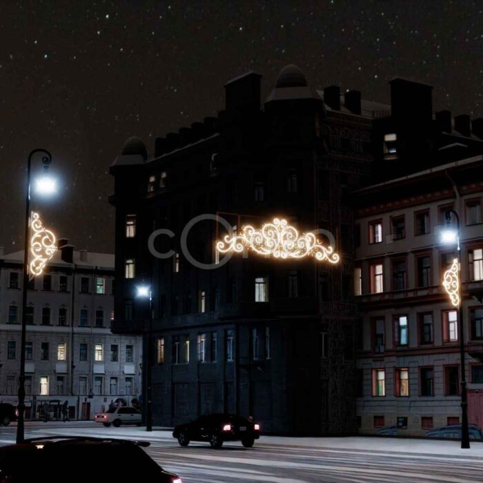 Набор для украшения проспекта «Золотые узоры» — это готовое комплексное решение от JOYLED для праздничного оформления центральных улиц, площадей и торговых зон. В комплект входят две консоли и одна перетяжка, выполненные в едином стиле и дополняющие друг друга.