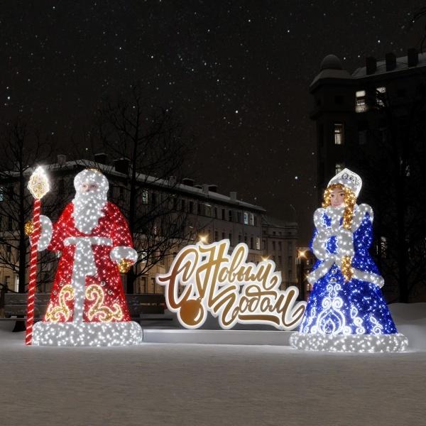 Эффектная новогодняя световая композиция: надпись «С Новым годом!» и фигуры Деда Мороза и Снегурочки. Три каркасные 3D-фигуры из алюминия с холодным свечением. Подходят для улицы, устойчивы к морозу и влаге (IP65), питание 24 В. Яркий праздничный акцент для ТЦ, парков и городских пространств. Полный комплект, готов к подключению.