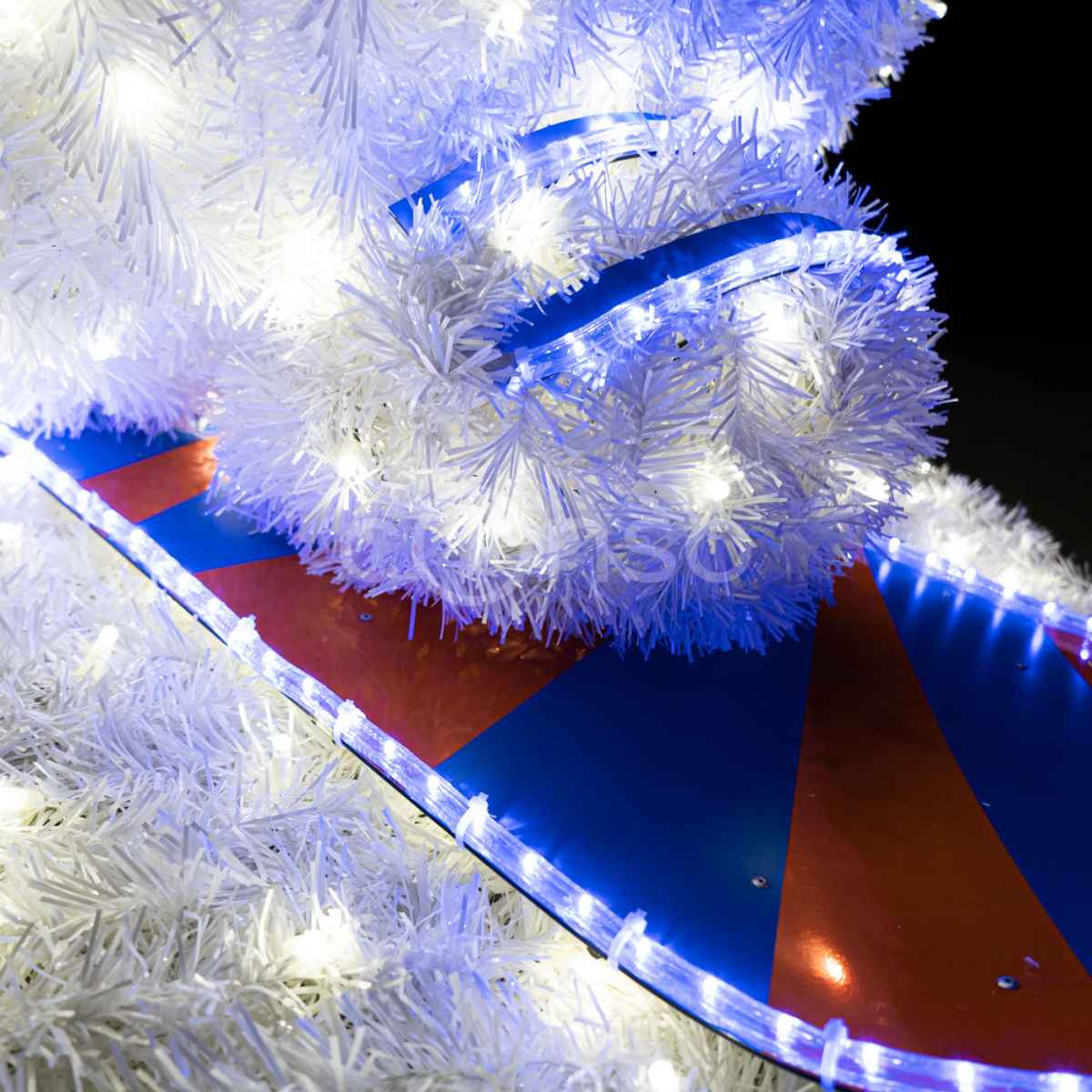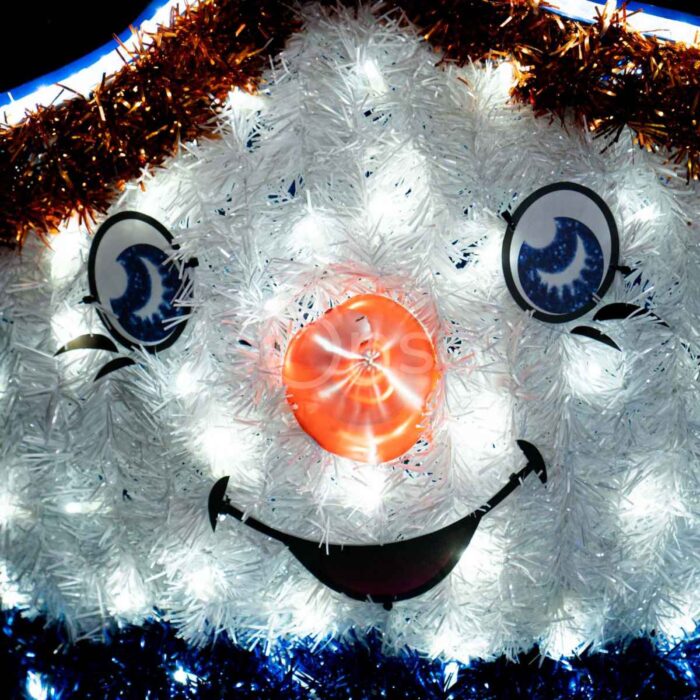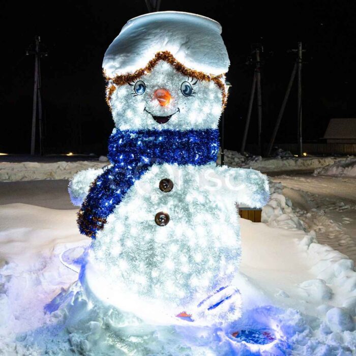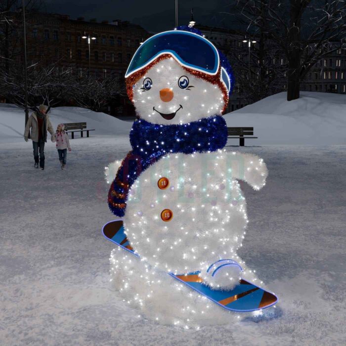 Световая фигура снеговика в образе сноубордиста. Каркас из алюминия, мишурная отделка, холодный свет. Высота — 2,45 м. Надёжная и устойчивая конструкция, IP65. Подходит для улиц, парков, ТЦ, катков. Привлекает внимание и создаёт зимнее настроение.