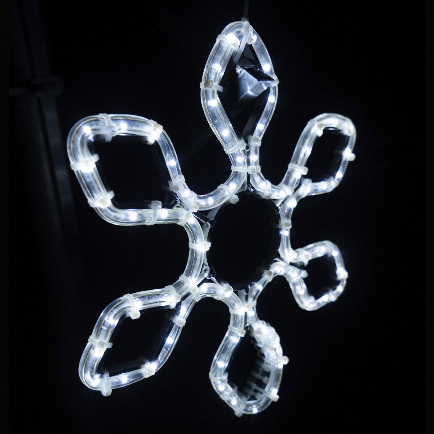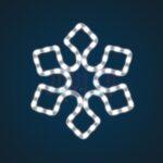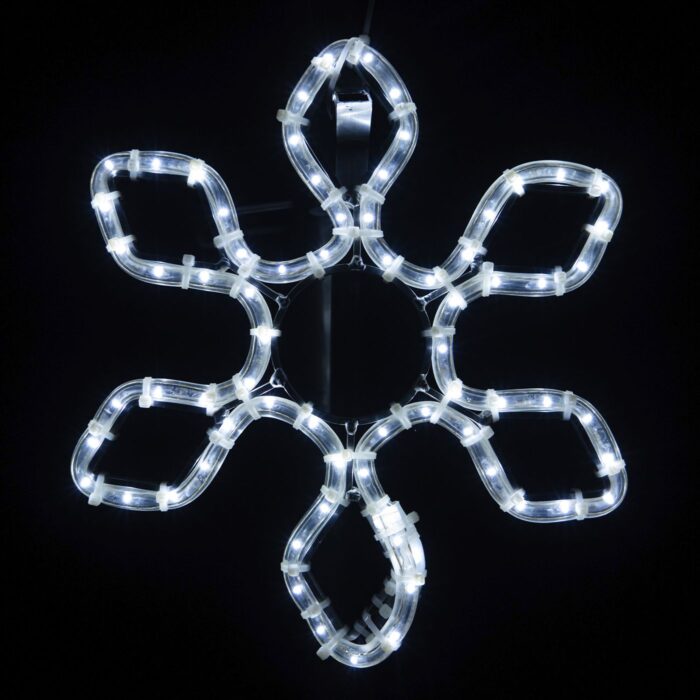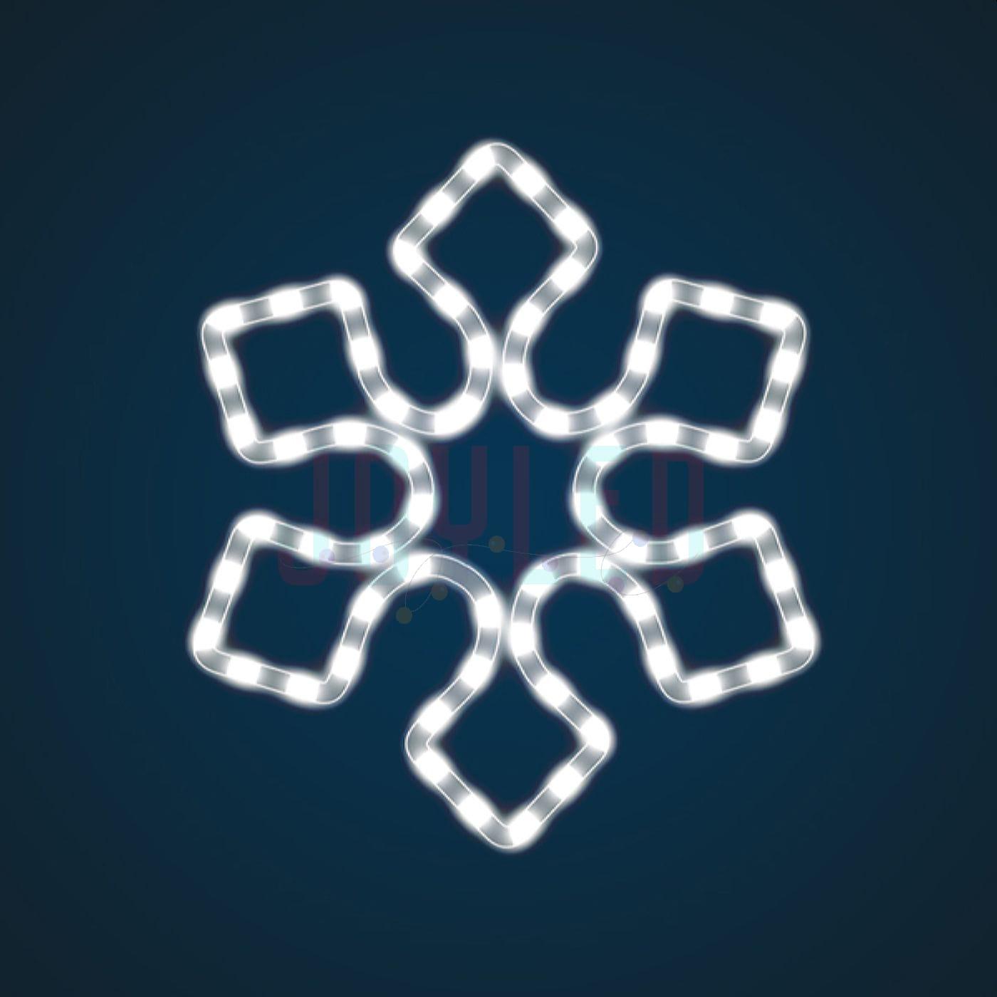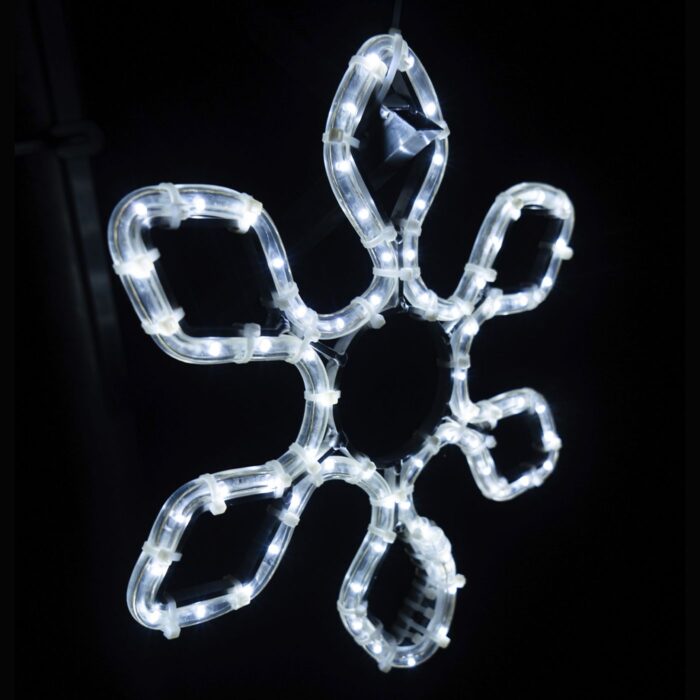 Снежинка притягивает взгляд: аккуратная геометрия и холодный свет формируют ощущение чистоты, зимней свежести и праздника. Такая фигура одинаково уместна и в городской среде, и в частных проектах — от загородного дома до уличной иллюминации торгового центра.