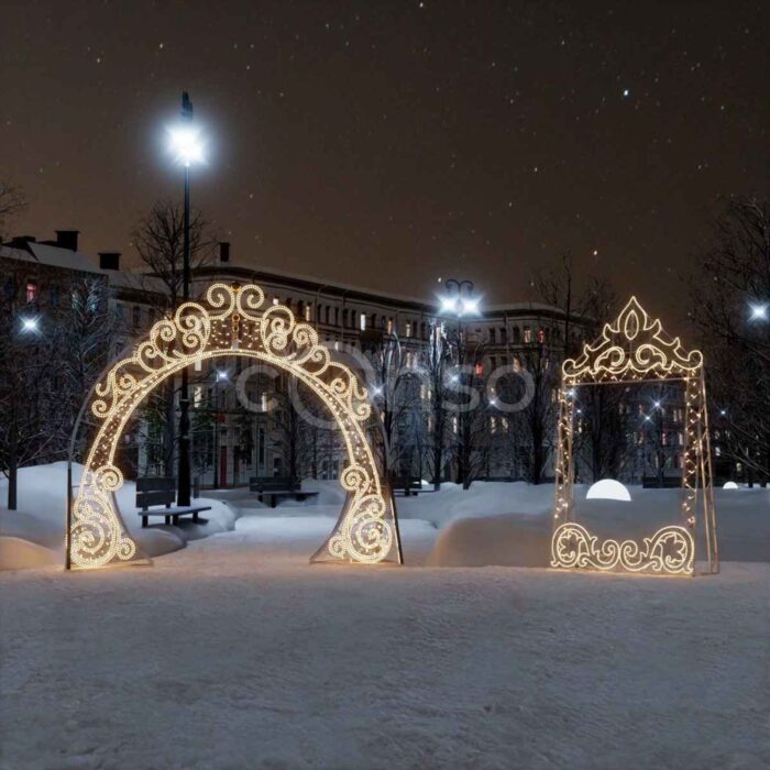 Арка «Снегурочка» с селфи-рамкой «Винтаж» от JOYLED — праздничный комплект для улицы. Арка 3,8×3,3×1,8 м и рамка 2,3×3,13×0,85 м создают эффектную фотозону с золотым свечением. Каркас из алюминия с покраской, защита IP65 и срок службы до 50 000 часов гарантируют надёжность и долговечность. Подходит для парков, площадей, ТЦ и жилых комплексов. Доступен монтаж под ключ.